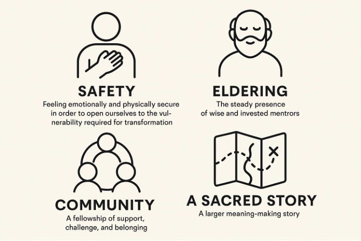 Two decades ago while doing my PhD work, I discovered Michael Gurian’s research, writing on male initiation, and observing that across Indigenous and non-Western cultures, initiation rites almost always involve suffering—sometimes profound suffering. But that suffering is never imposed in a vacuum. Gurian notes four conditions that consistently surround initiation: safety, an elder, community, and a sacred story.